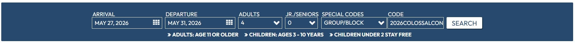 To book your room, select the group/block option under the "special codes" section and use code "2026COLOSSALCON" at the link below: