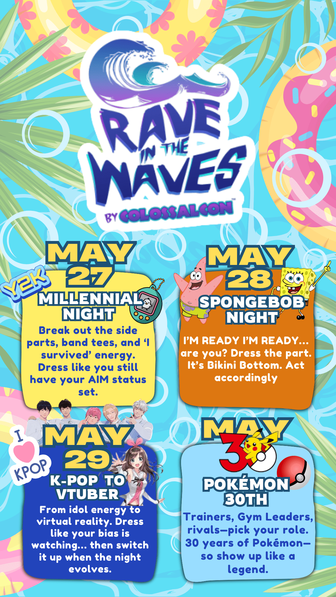 The waves are calling, and each night of Rave in the Waves is bringing a whole new vibe. We’re kicking things off Wednesday with Millennial Night, throwing it back with the hits that raised a generation. Thursday dives under the sea for SpongeBob Night, followed by Friday’s high-energy journey from K-pop to VTuber beats. Then we close it all out Saturday with Pokémon Night so get ready to dance like it’s your final battle!